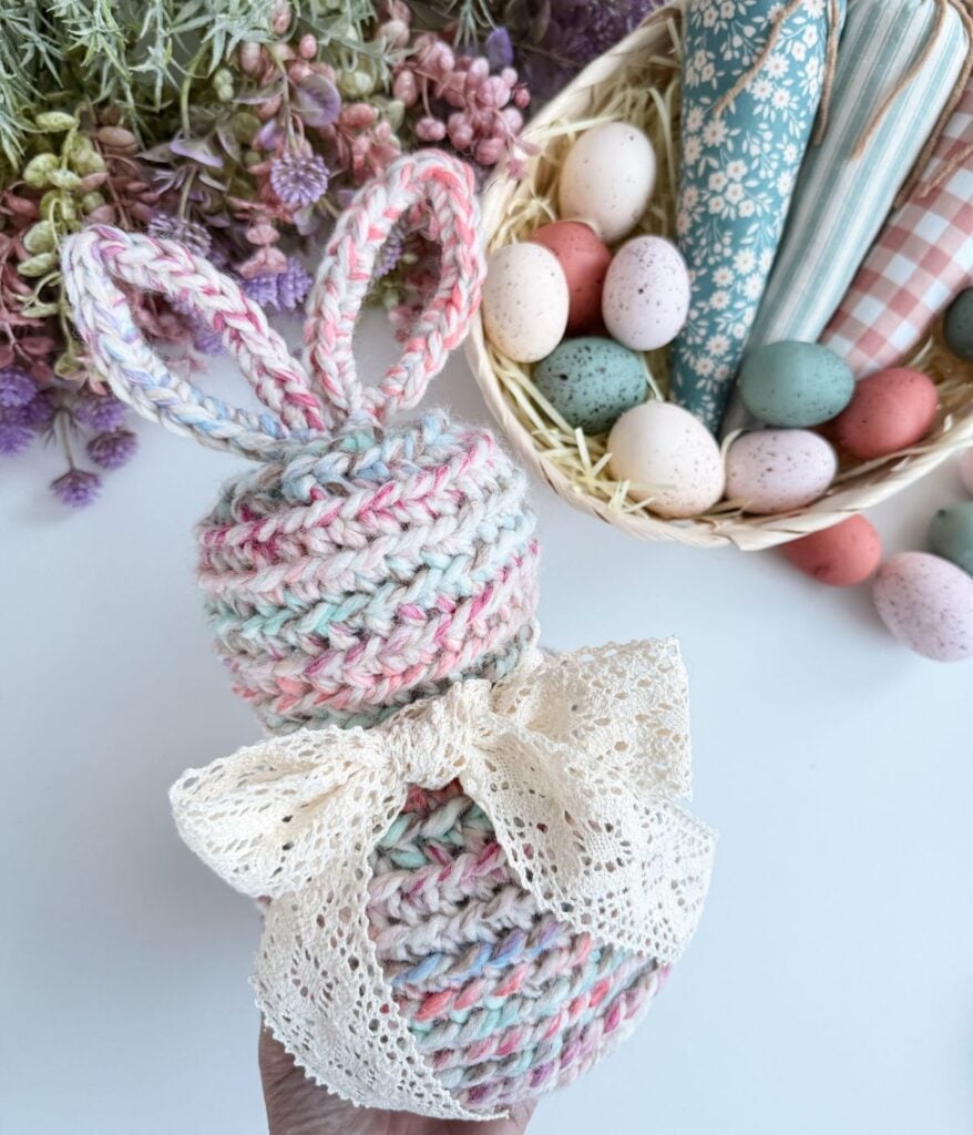 The bunny is crafted seamlessly in the round in one piece using 3 strands of worsted weight yarn held together to create a super bulky yarn. Its charming ears are constructed using pipe cleaners, crocheted over and shaped into adorable bunny ears.