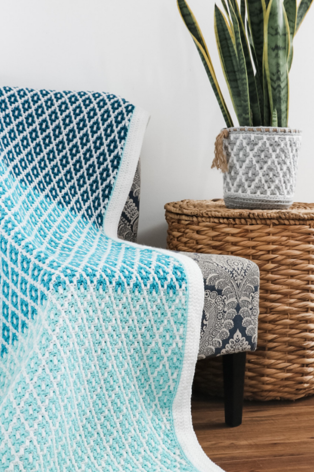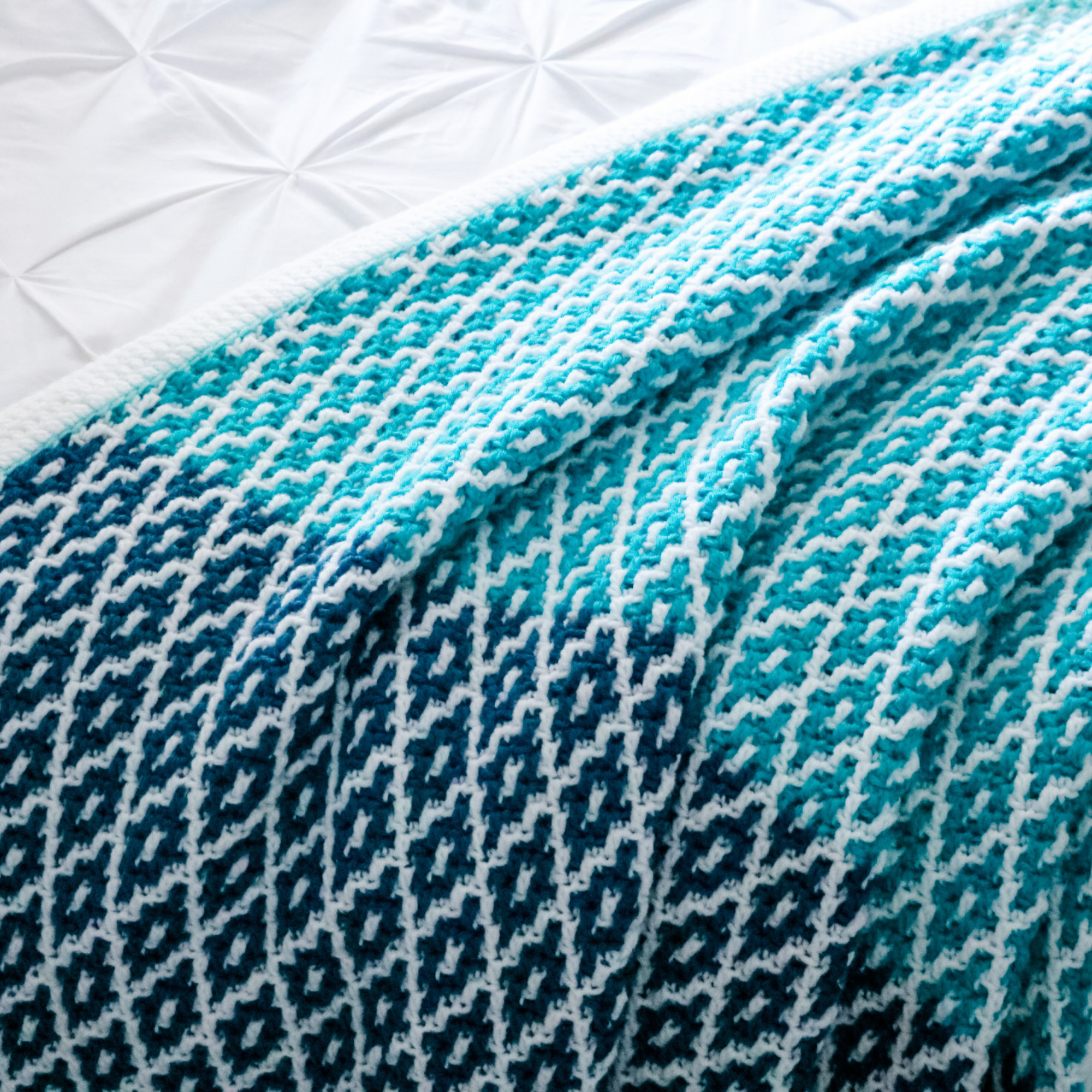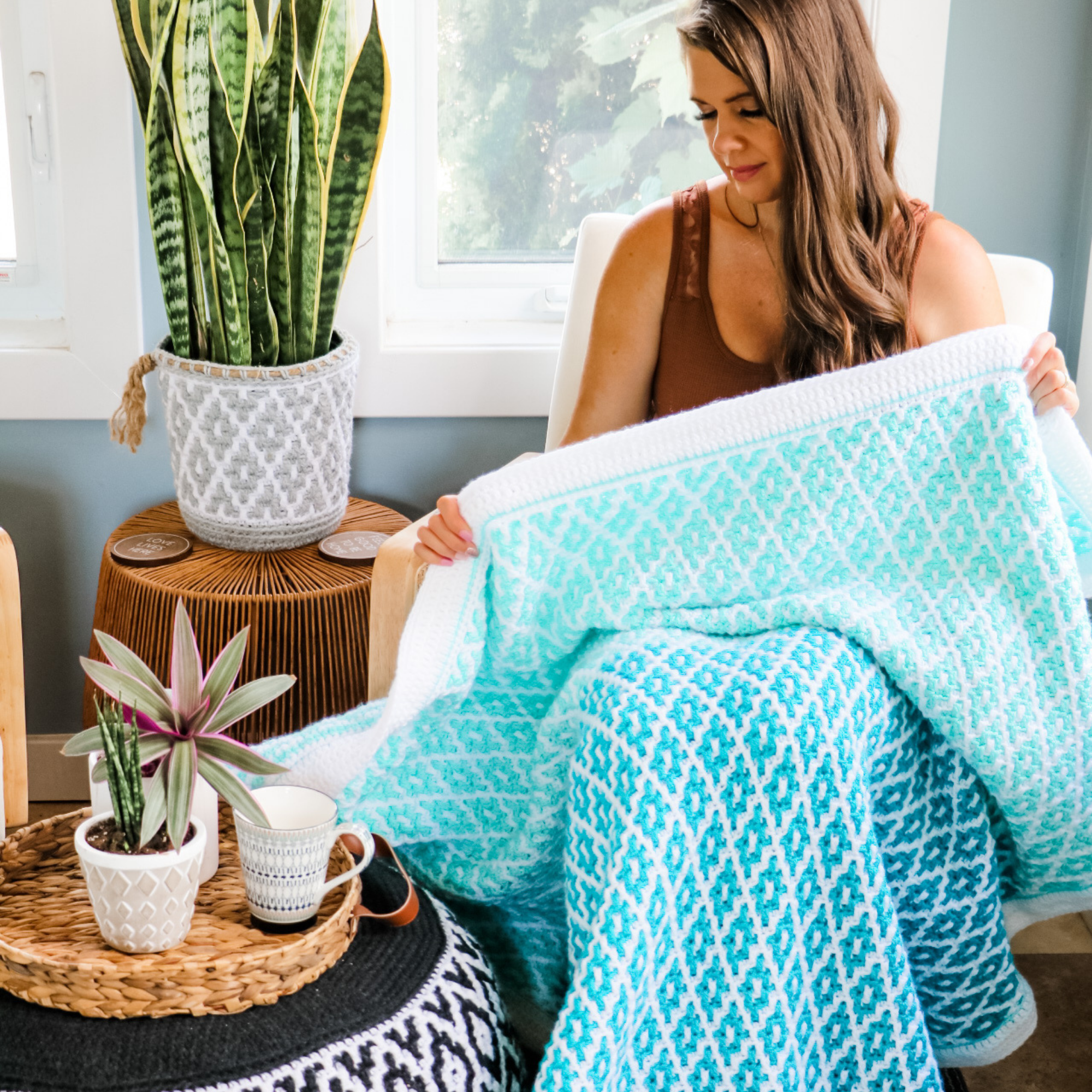 Choose colours to match your home decor. I love blue, so it was an easy choice for me! For most of my mosaic collection patterns, I’ve used Brava worsted weight yarn. For this blanket, I had several balls of Bernat Premium, so I used my stash to work up this blanket.