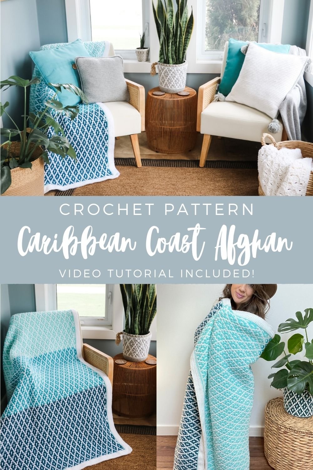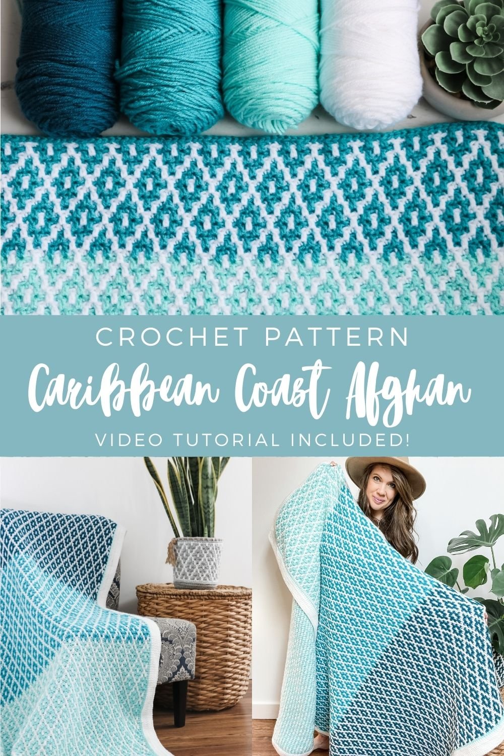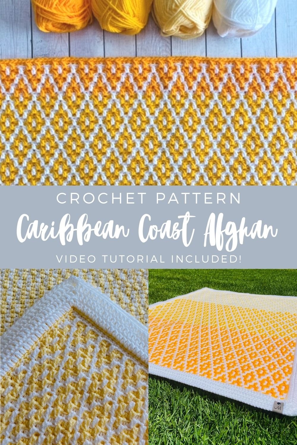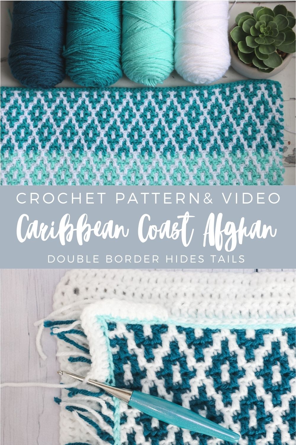Learn mosaic crochet by crocheting this beautiful Caribbean Coast Afghan crochet pattern. If you love colourwork but hate carrying yarn and changing colours, you will love this crochet Afghan! Adding a double border eliminates having ends to weave in. The crochet pattern Includes a video tutorial.