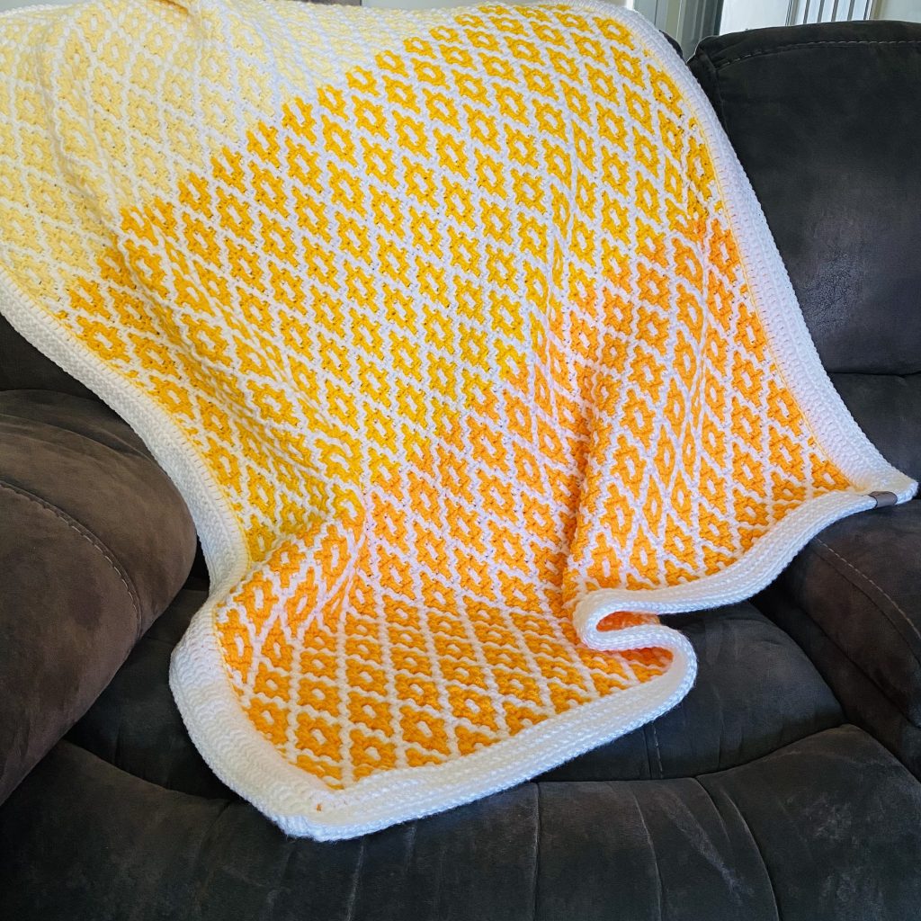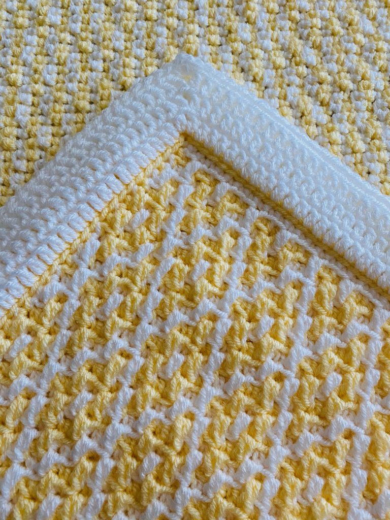I love this yellow combo my tester Trish used for her Baby size blanket. A – white, B – Custard, C – Canary and D – Caution