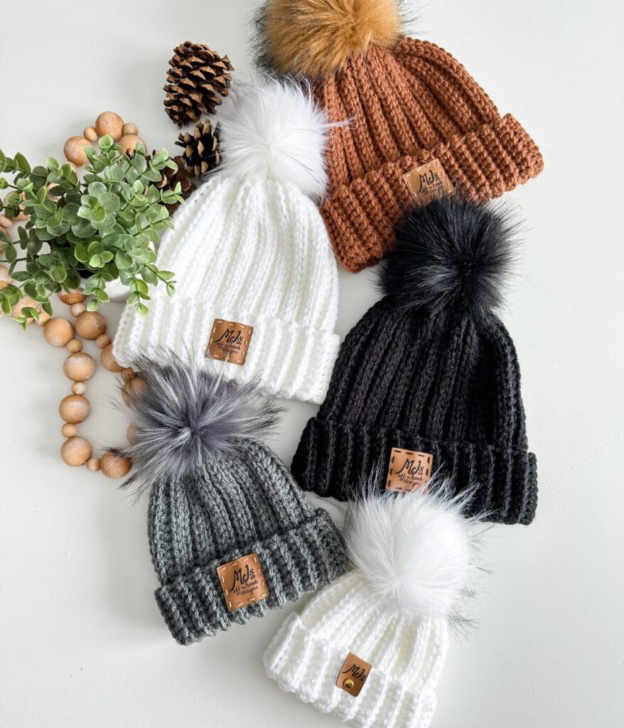 Style these crochet hats using matching coloured pompoms for a modern look. These bulky crochet hats are sure to look great with any outfit!