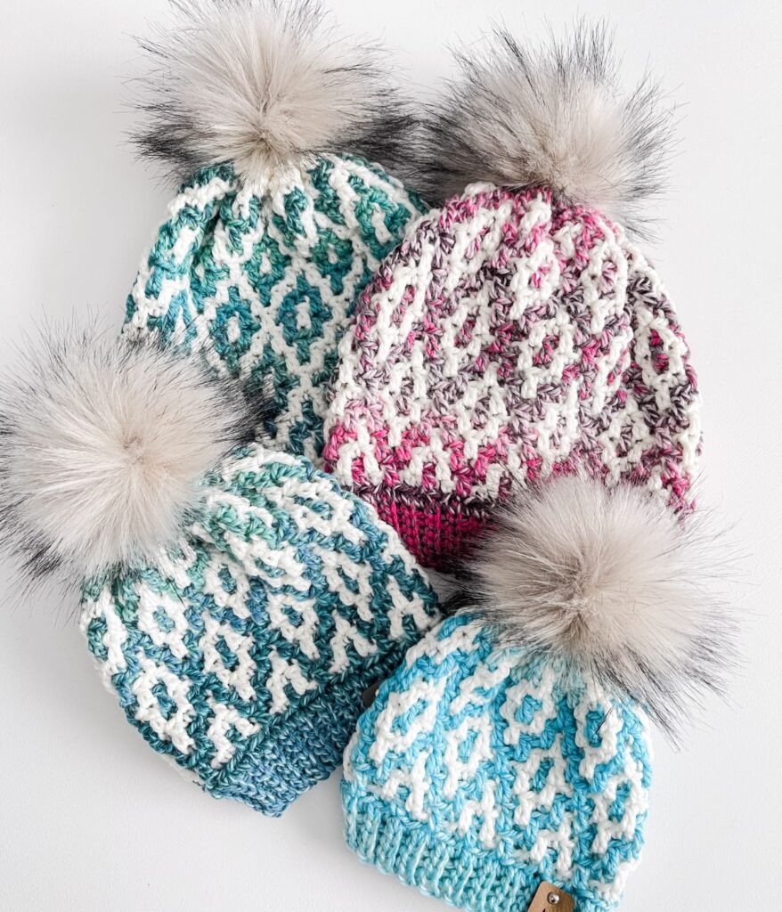If you’re looking for a yarn substitute I’ve listed a few that I think will work well. Make sure to meet the pattern gauge of 13 sts and 13 rows equal to 4″ in the Mosaic Pattern when crocheting this hat so that the sizing will be correct.