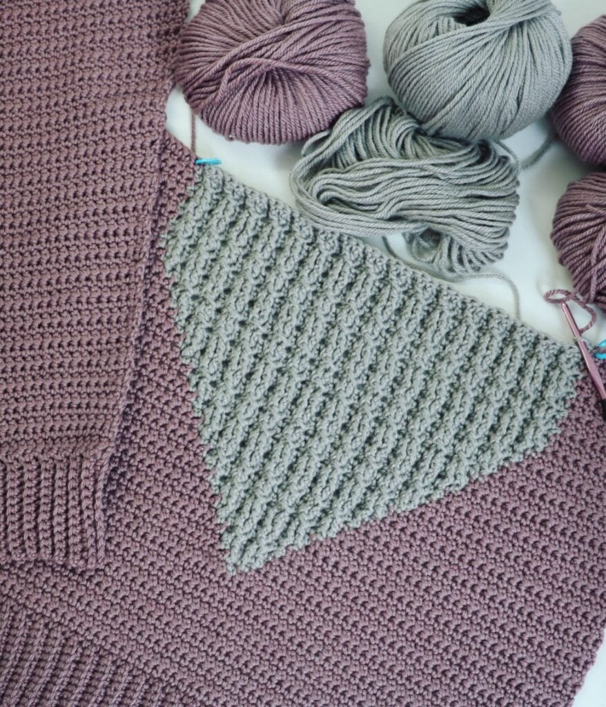 Positive ease of 2-4″ allow for a cozy fit. Perfect fashionable sweater for fall, winter and spring wear. Designed in Gloss DK a beautiful blend of merino and silk from WeCrochet. Shown in Velveteen and Robot.