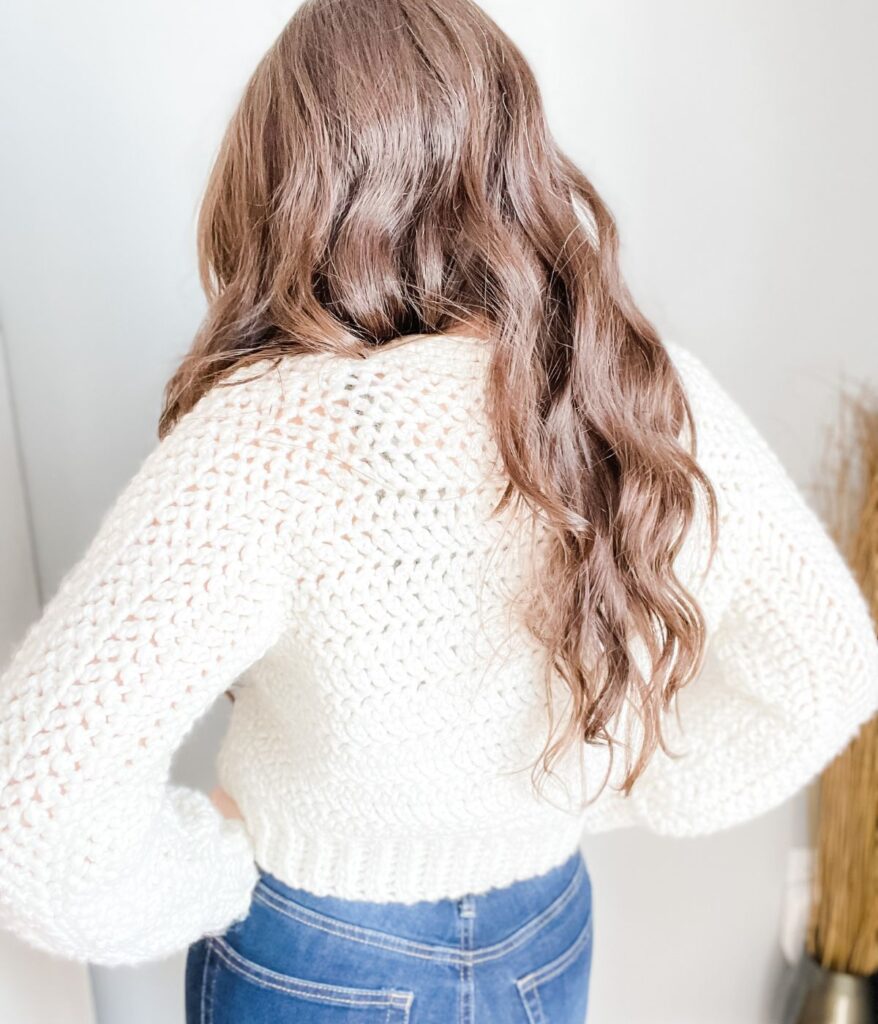 You can easily modify the length to suit your body or make it a long crochet cardigan. If you’re going to go long, why not make it a crochet cardigan with pockets! The pockets and long length give this cardigan a completely different look and add the ultimate cozy factor to this oversized crochet sweater.
