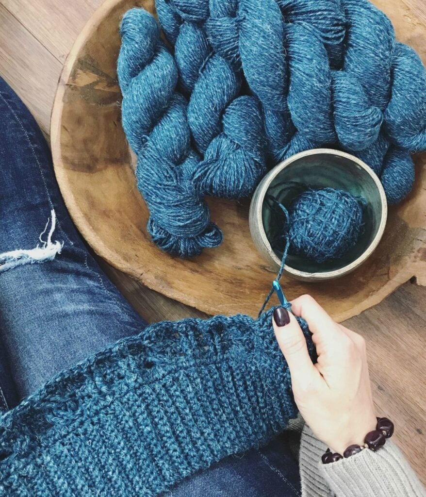 The gorgeous crochet cable stitch works up beautifully in a 2-row repeat. This masculine cozy crochet design is made in Sugar Bush Yarns Shanty, shown in Sea Glass. Unfortunately, this yarn has been discontinued but I have a list of alternative yarns you’ll love for this cabled crochet sweater pattern.