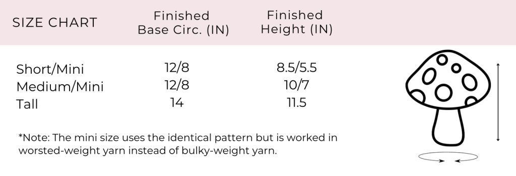 Mini Size: To make a mini mushroom, follow the same pattern using worsted weight yarn and a 5mm crochet hook.