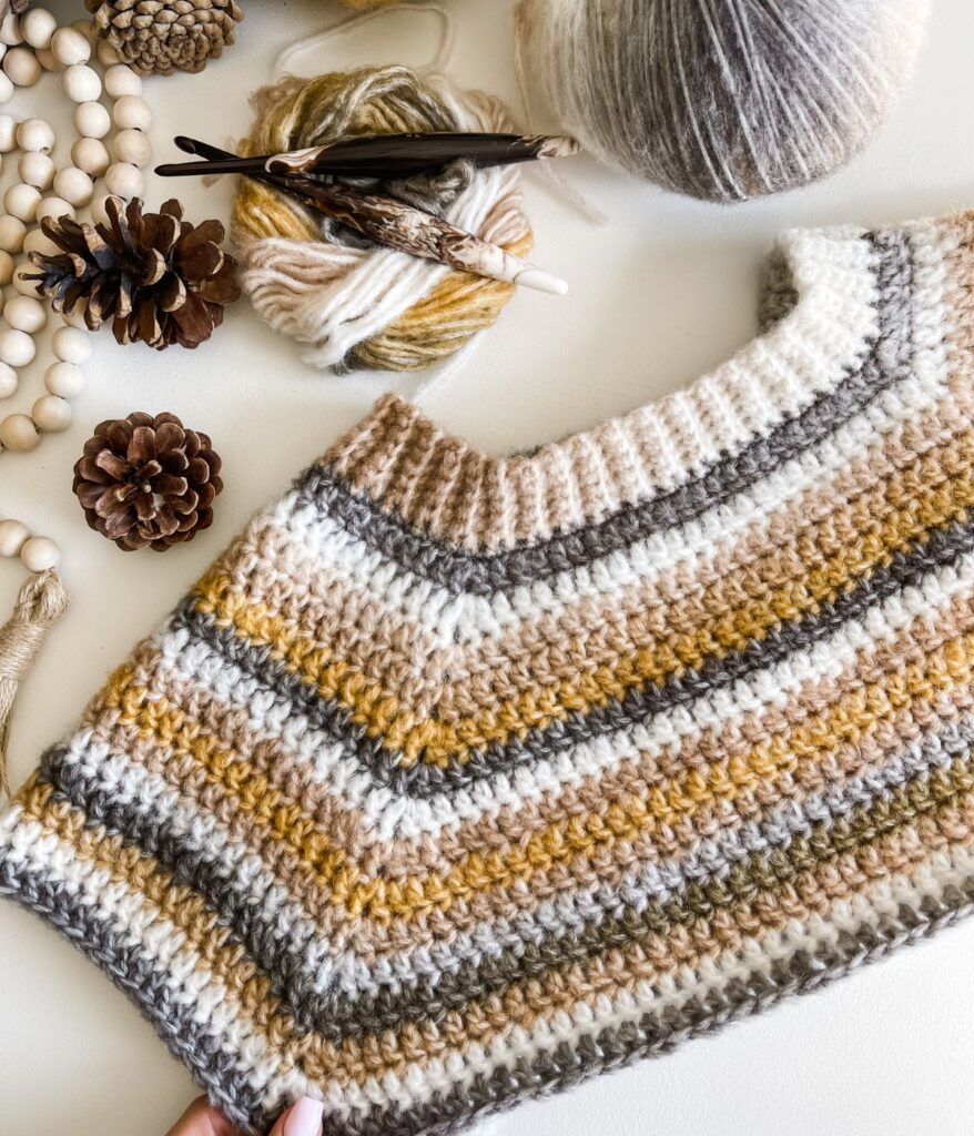 You’ll be surprised at how quickly this crochet sweater works up. I chose to use double crochet stitches to keep the pattern beginner-friendly, plus it was enjoyable to breeze through the pattern so fast. It’s worked all in one piece with no seaming involved!