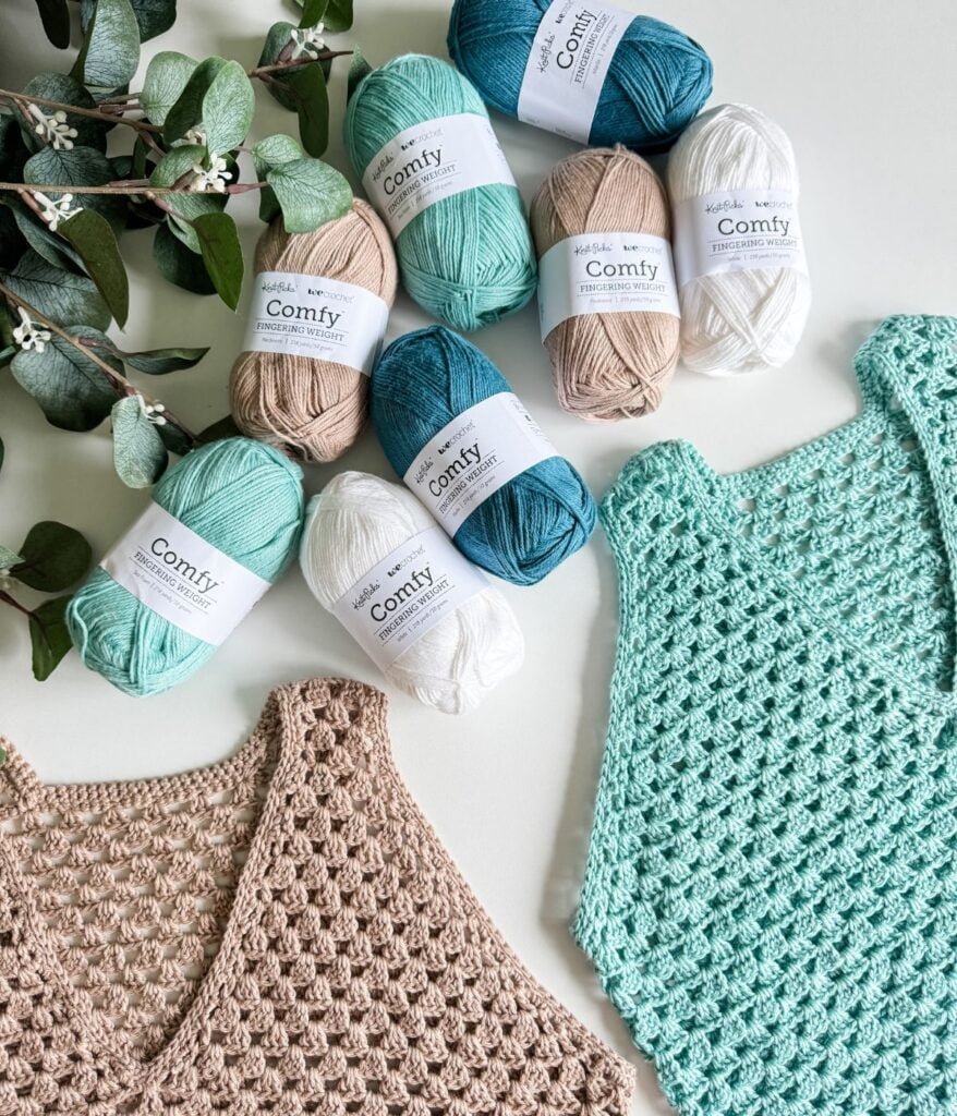 The best yarn for crochet garments is durable, comfortable, and perfectly suited to your needs. For summer projects, my favourite is the Comfy line from WeCrochet. Comfy yarn is incredibly soft, breathable, and affordable, with a silky feel that’s perfect for warm-weather wear—even though it’s not actually silk.