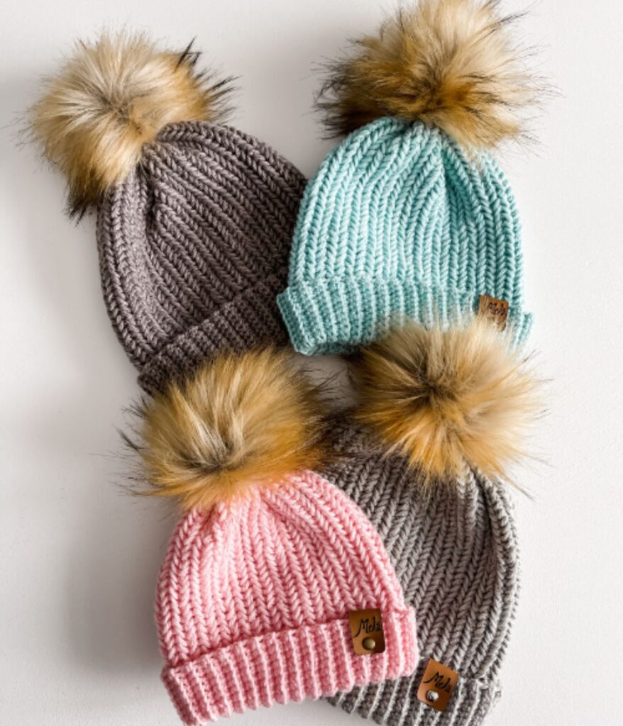Make a yarn pom pom or attach a faux fur pom pom. Sew snap to the top of the hat. Blow-dry pom to fluff and snap to the top of the hat. Add a garment tag for a personalized touch.