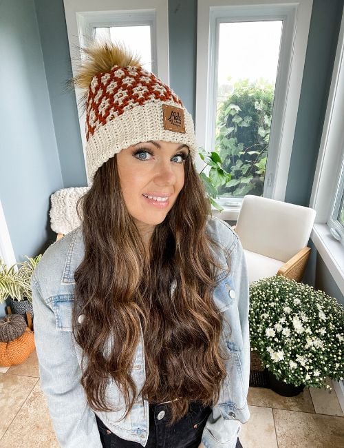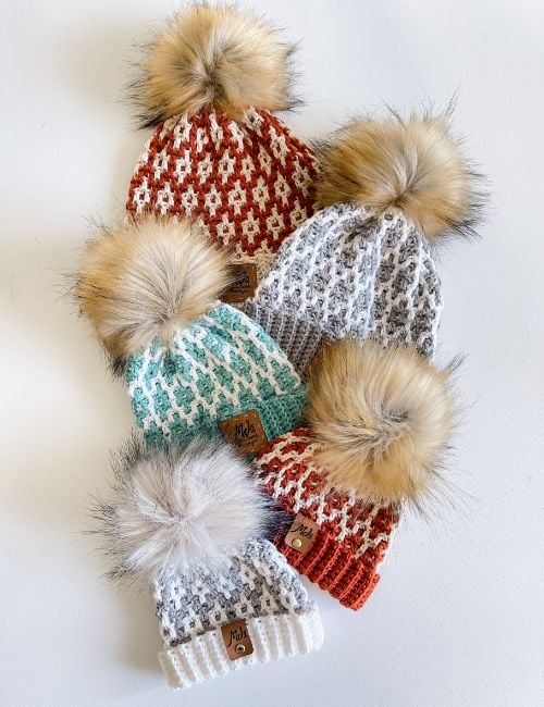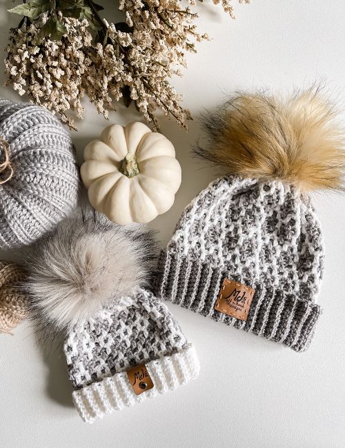 The hat pattern is crocheted in the overlay mosaic crochet technique. It’s a quick and easy way to create beautiful colourwork patterns without having to change colour throughout the round. This crochet hat will quickly become a family favourite in sizing from Baby to Large Adult.