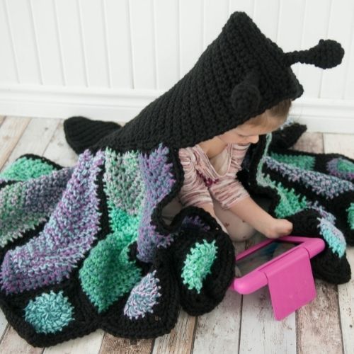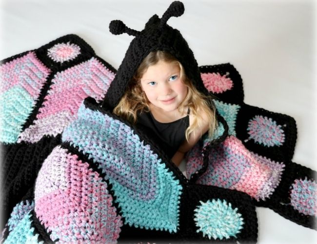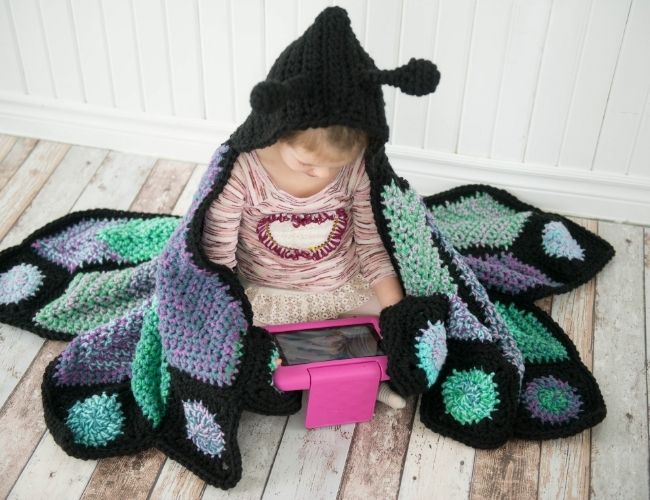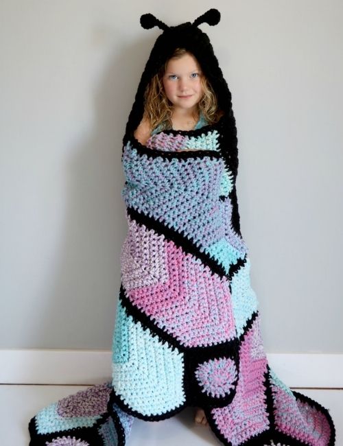 The Crochet Hooded Butterfly Blanket is a fun crochet blanket for all ages. The crochet pattern includes a toddler, child and adult size.