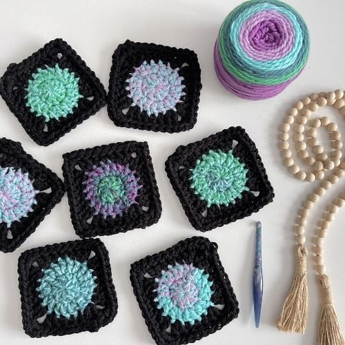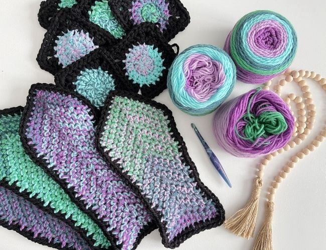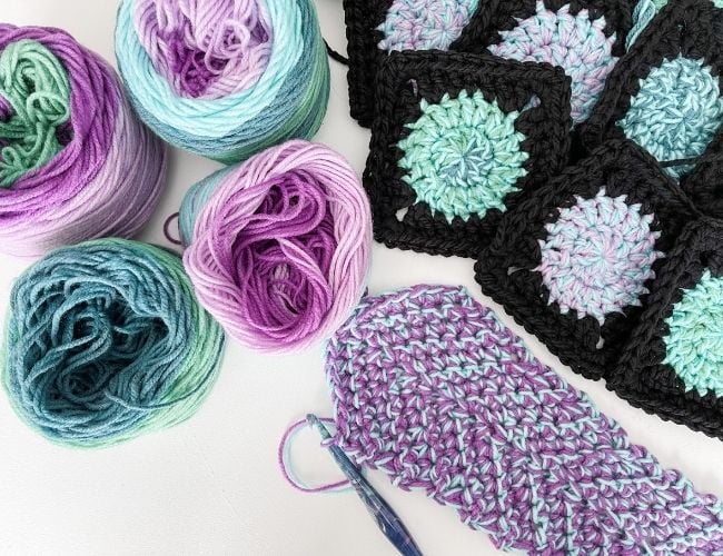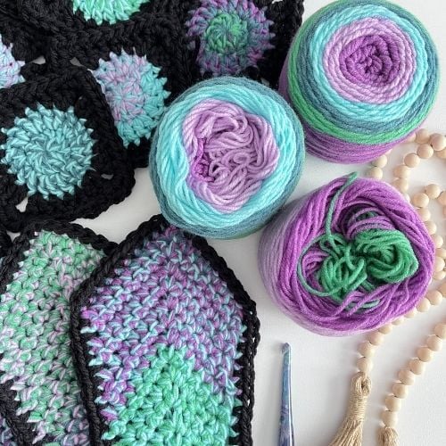 The fun part of planning a design is always the yarn! I’m a little obsessed with cake yarns, they are so fun and beautiful to work with. For the Hooded Butterfly blanket, I decided to try Bernat Pop holding 2 strands together. I did a bunch of experimenting and was pleasantly surprised at how fun they blend together when using 2 strands at once. As a result, it was the perfect look I wanted for my butterfly wings.