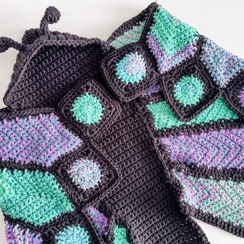 Wrap yourself in this cozy Hooded Butterfly Blanket. Perfect for cuddling, play and display. Our Butterfly Blanket Crochet Pattern features large wing panels and circle granny squares that are seamed together to form beautiful wings. The stained glass colour effect is made by combining 2 strands of Bernat Pop, and the rest of the blanket is worked in 1 strand of Bernat Softee Chunky.