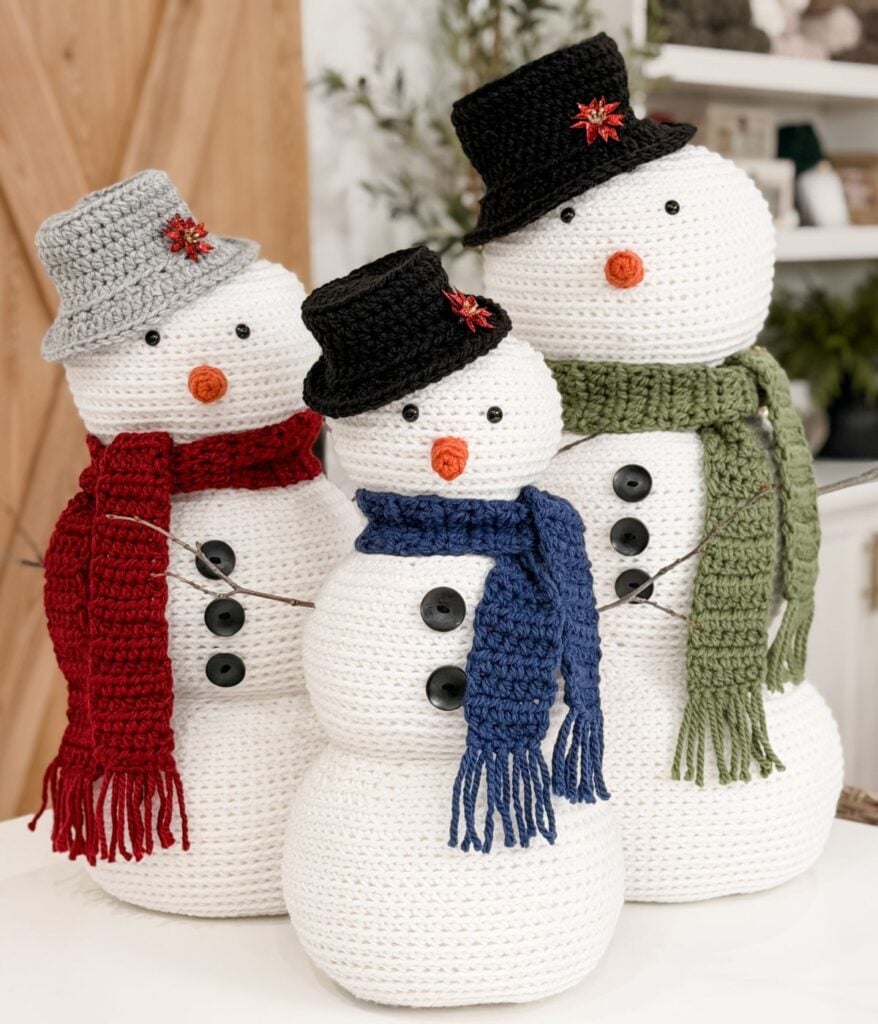 Meet the Jumbo Amigurumi Crochet Snowman Family, the happiest and squishiest holiday decor you will crochet this season. This adorable trio comes in three sizes so you can create a full snowman family for your entryway, fireplace hearth, or Christmas display. The medium size is free here on the blog, and the small and large sizes are available inside the premium PDF pattern.