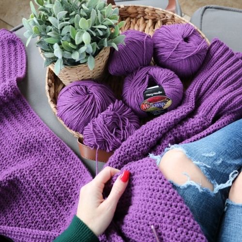 I crochet the Mauve-A-Lous Duster Cardigan in Mary Maxim Mellowspun DK (CDN) 70% Acrylic, 30% Nylon (174 yds/160m/50g/1.75oz) Shown in Dark Mauve. You can no longer get this colour, but they have other beautiful options available. Mellowspun is on the light side of a DK and is very similar to some Sport weight yarns. Many DK-weight yarns you will find to be a little thicker. Compare the yards per gram to find a suitable alternative.