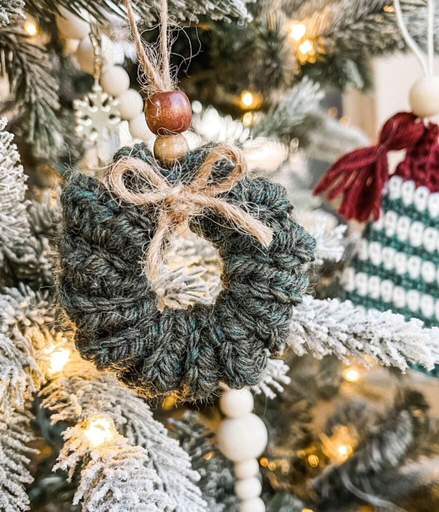 Make these adorable Mini Christmas Wreath Ornaments. This simple and quick Christmas wreath free crochet pattern is made by crocheting a curly Q. Add a twine bow to the wreath and top with wooden beads for an earthy touch. Hang with twine for a rustic Farmhouse decoration. Hang it onto the Christmas Tree or use it as a present topper. Keep scrolling for the free crochet pattern.