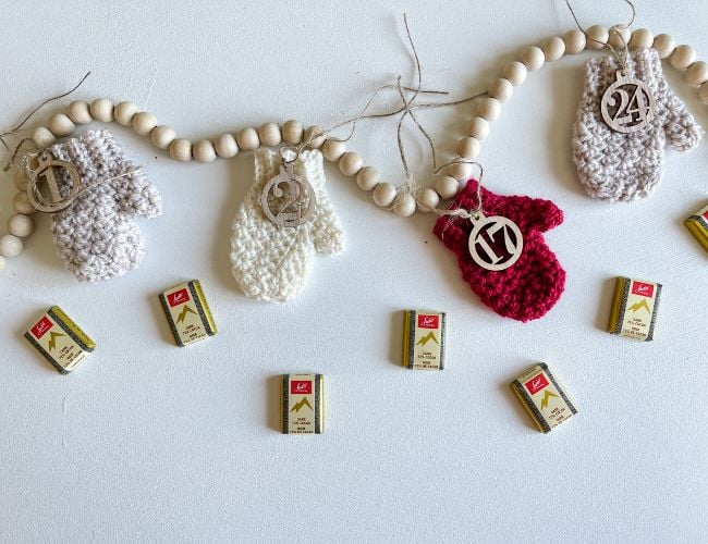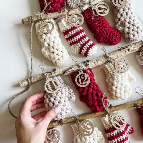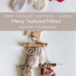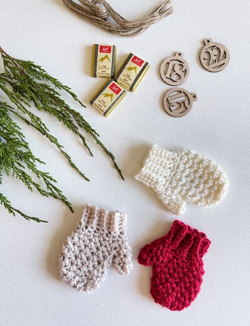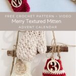 Crochet this cute Mini Textured Mitten for your Advent Calendar. Mittens can also be used as an ornament for your Christmas Tree or a present topper. Fill the mittens with treats, add an ornament hanger or attach wooden numbers with twine to hang on the Advent Tree Ladder. This pattern is a great crochet project for Christmas. The quick and easy crochet pattern includes a video tutorial.