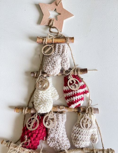 Make a Rustic DIY Tree ladder to display crocheted stockings and mittens. A tree ladder is a fun and festive way to display an advent calendar. You could also show mittens and stockings on a beaded garland or a large picture frame with twine. Make your tree ladder by following this tutorial or purchase a pre-made tree from Amazon.