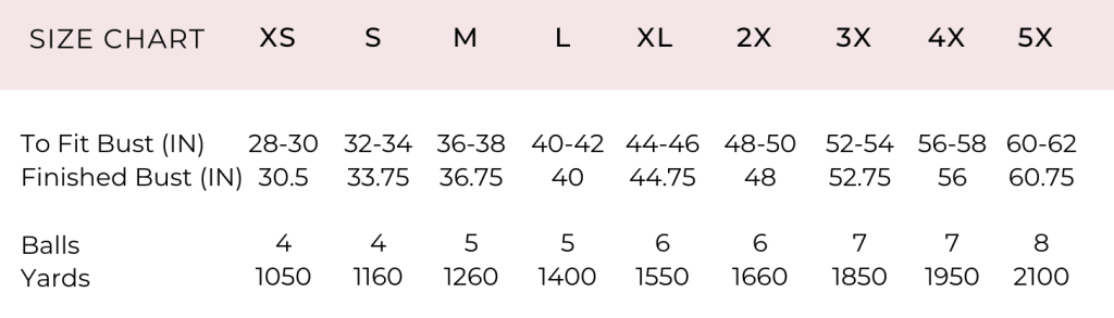 Please note, this design is intended to be a close fit with negative ease for the larger size range. If you prefer a more relaxed or oversized fit, consider sizing up. When choosing your size, refer to your preferred Finished Bust Measurement. For reference, the model is wearing a size Medium, has a 36″ bust, and is 5’6″ tall.