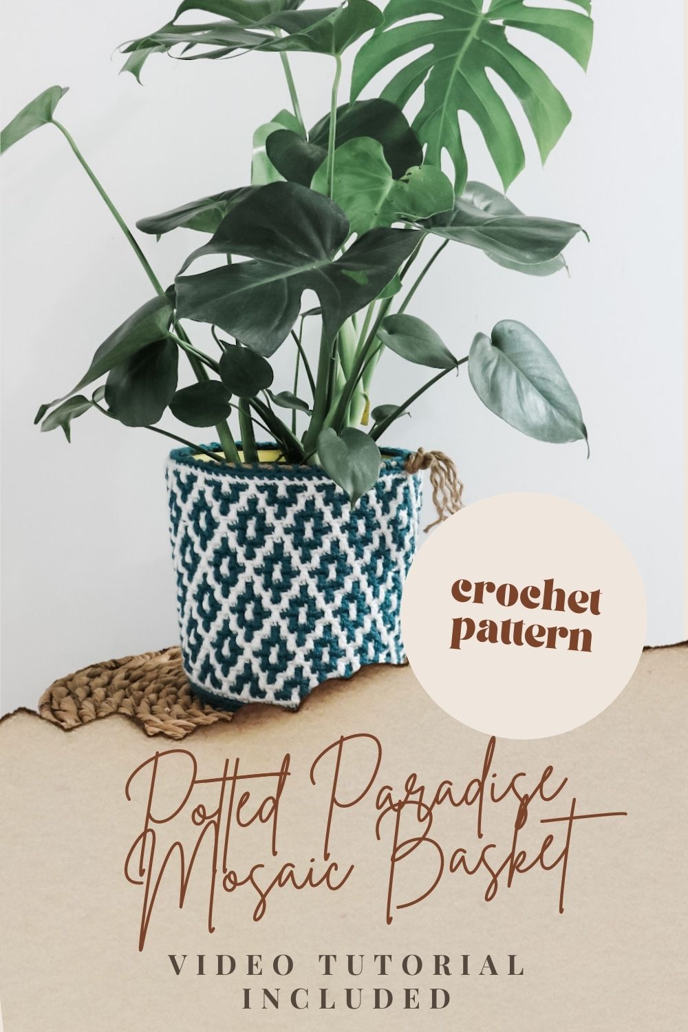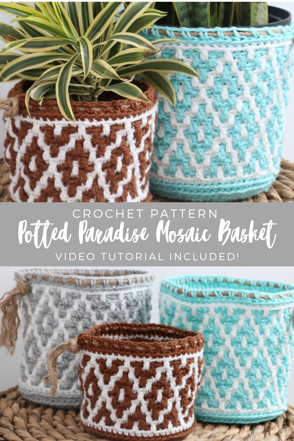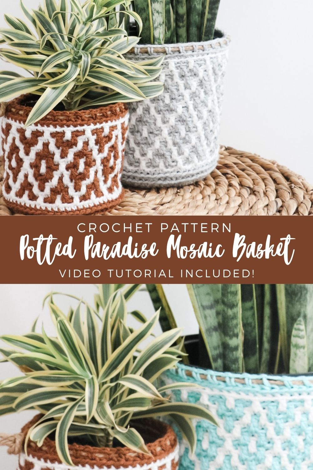 The Potted Paradise Mosaic Basket crochet pattern. This beautiful mosaic crochet basket pattern includes three sizes. You can use them as decorative baskets throughout your home or as plant pot covers. Rather than using super bulky yarn, the pattern is worked holding together 2 strands of worsted weight yarn. A free video tutorial is included on YouTube so that you can easily crochet this pattern.