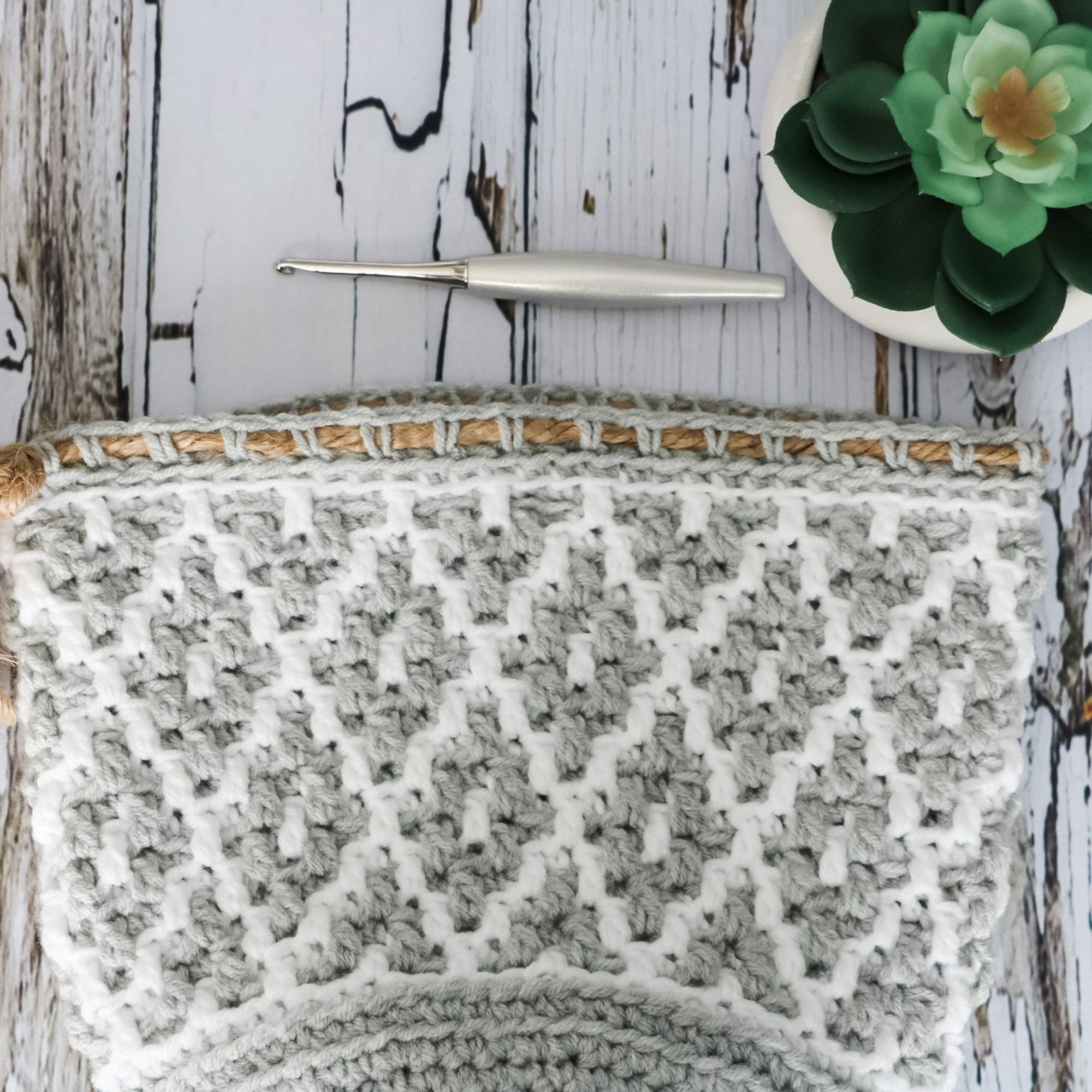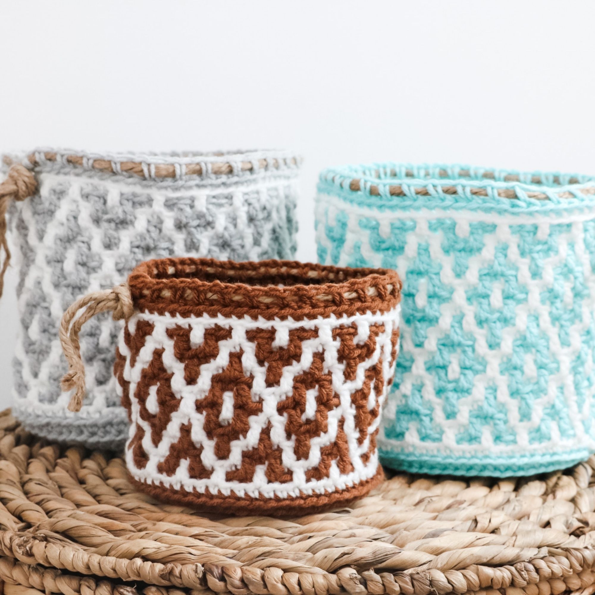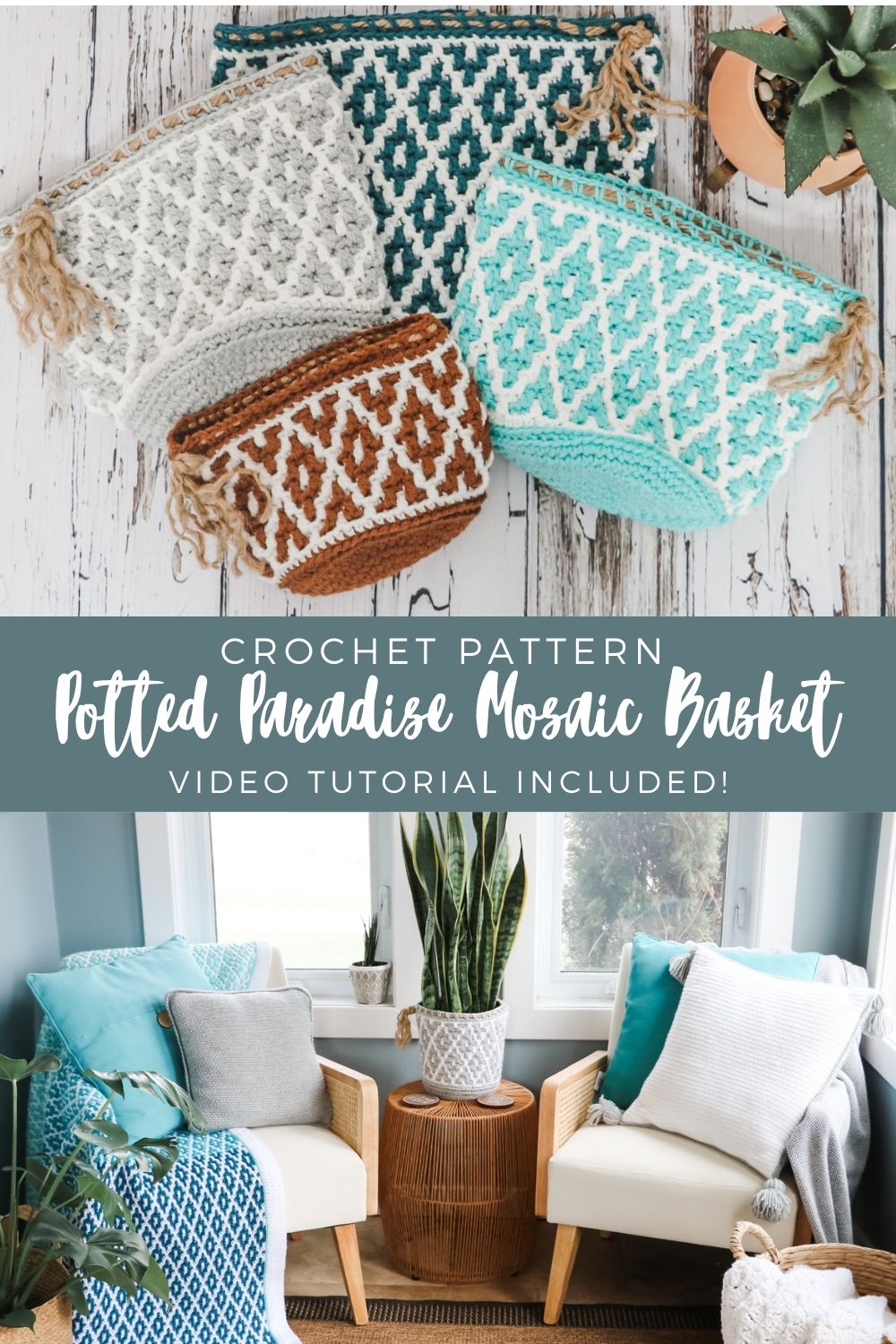 The Potted Paradise Mosaic Basket crochet pattern. This beautiful mosaic crochet basket pattern includes three sizes. You can use them as decorative baskets throughout your home or as plant pot covers. Rather than using super bulky yarn, the pattern is worked holding together 2 strands of worsted weight yarn. A free video tutorial is included on YouTube so that you can easily crochet this pattern.