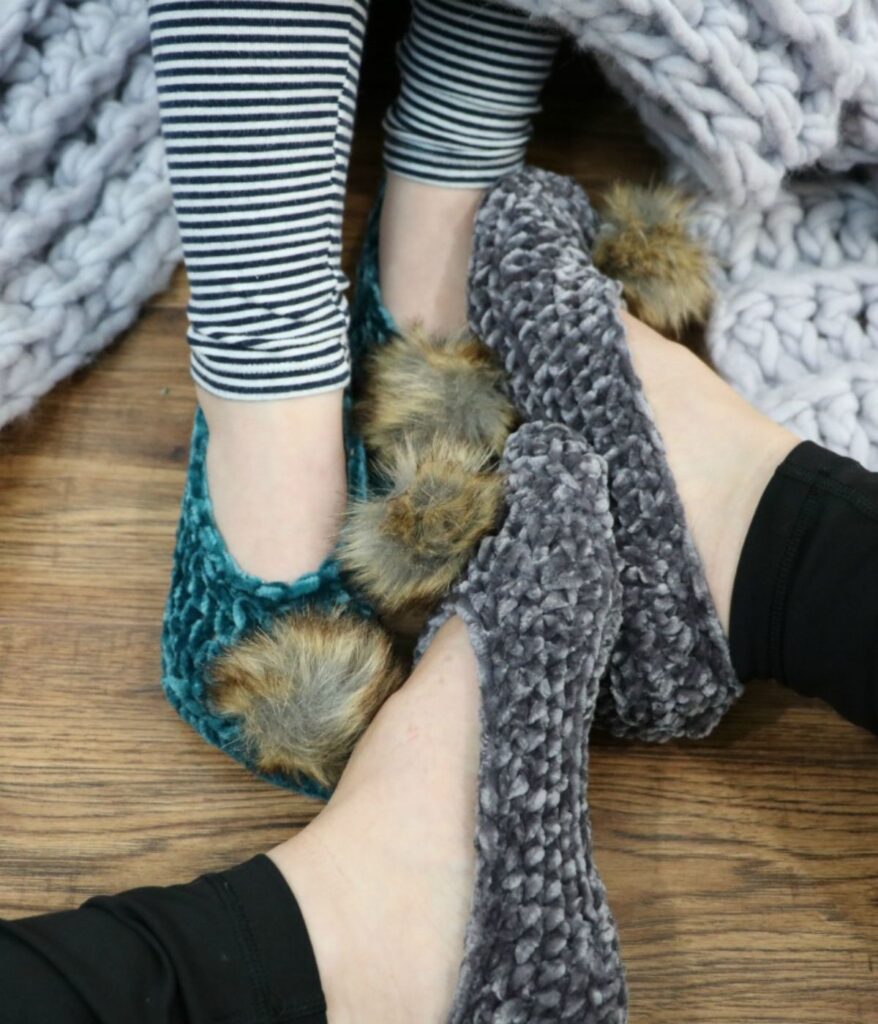I’m so excited to share this quick & easy Velvet Ballet Slippers crochet pattern with you! Crochet slippers pattern includes a free video tutorial on YouTube. The tutorial also includes how to make the faux fur pompoms. The PDF pattern includes children Sizes 9/10 (11/12, 13/1, 2/3, 4/5) and adult Sizes 4/5 (6/7, 8/9, 10/11, 12/13).