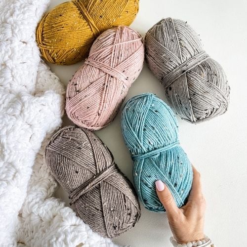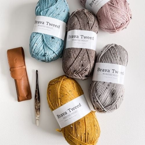 Create sophisticated projects in easy-care Brava Tweed! Premium acrylic is enhanced with flecks of viscose Tweed to add depth to sweaters, blankets, and more while maintaining the durability and affordability you can expect from the Brava family. The range of coordinating colours all feature cream, coffee, and charcoal tweed flecks, and for even more colour options, Brava Tweed can mix and match with Brava Worsted or Brava Speckle to create beautiful projects! Hypoallergenic, hard-wearing, and machine washable, as always, Brava Tweed is sure to please. – WECROCHET