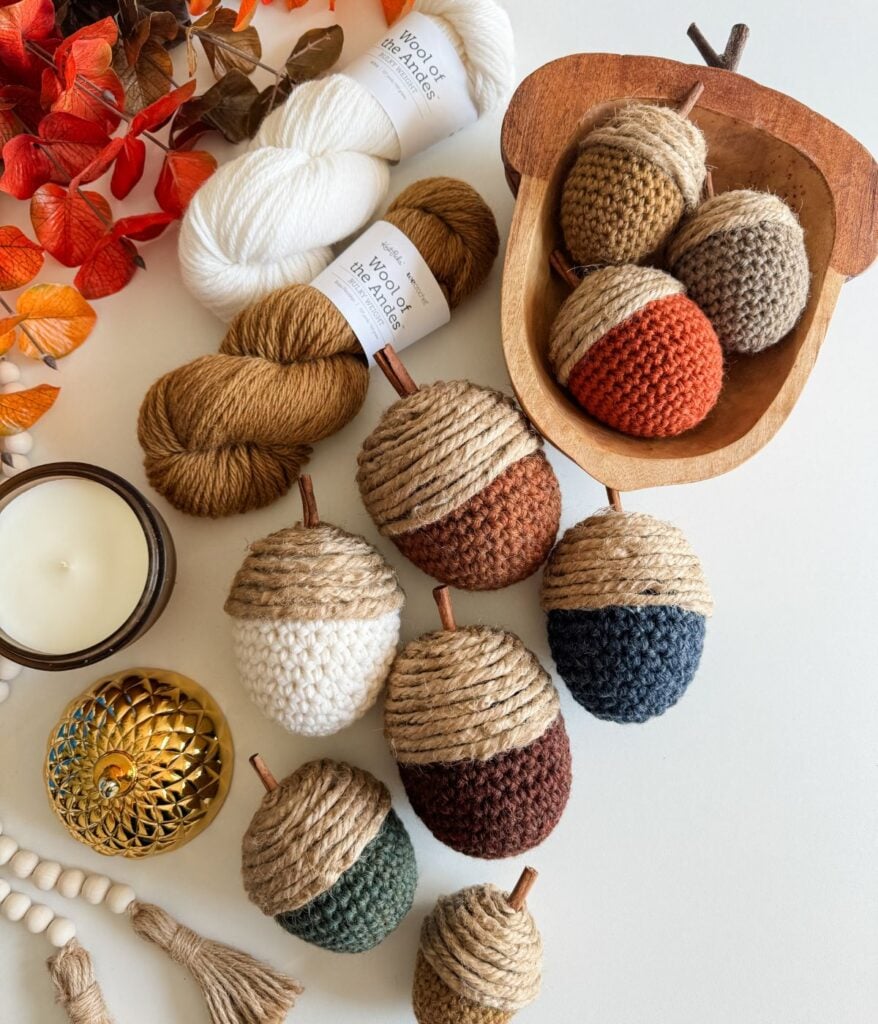 Our Rustic Farmhouse Crochet Acorn pattern features Wool of the Andes in both worsted and bulky weight yarn, chosen for its rustic appeal and wide colour variety. The great news is that gauge is not critical for this pattern, allowing you plenty of flexibility when selecting substitute yarns.