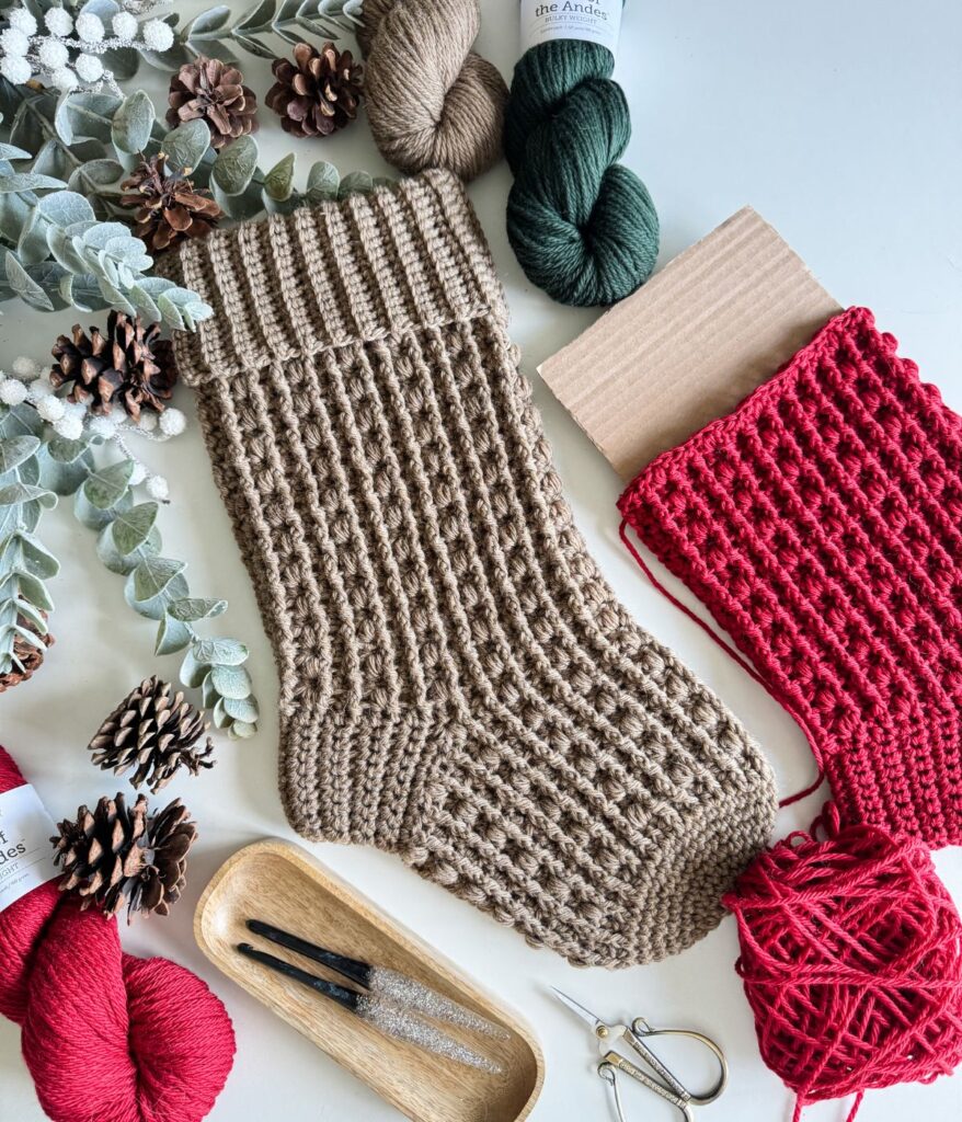 I’ve received so much wonderful feedback on how much you’ve loved the Snuggle Season Hat and Headband patterns, so I just had to design another piece using this stitch! With Christmas right around the corner, a stocking felt like the perfect choice.
