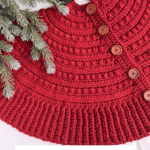 The Snuggle Season Tree Skirt is worked flat in rows, beginning at the inner base of the tree and increasing outward toward the outer edge. The main panel is built on a repeating puff-stitch pattern, with increases added to create the skirt’s gradual flare. After the main panel is completed, a join-as-you-go ribbed band is worked along the outer edge for a soft, stretchy finish. The inner edge is finished with a button-up closure, allowing the tree skirt to wrap easily around the base of the tree.