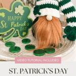 By changing the hat colours to classic green stripes and adding a shamrock detail, your farmhouse gnome transforms into a festive St. Patrick’s Day decoration perfect for decorating, gifting, or selling at spring craft fairs.