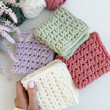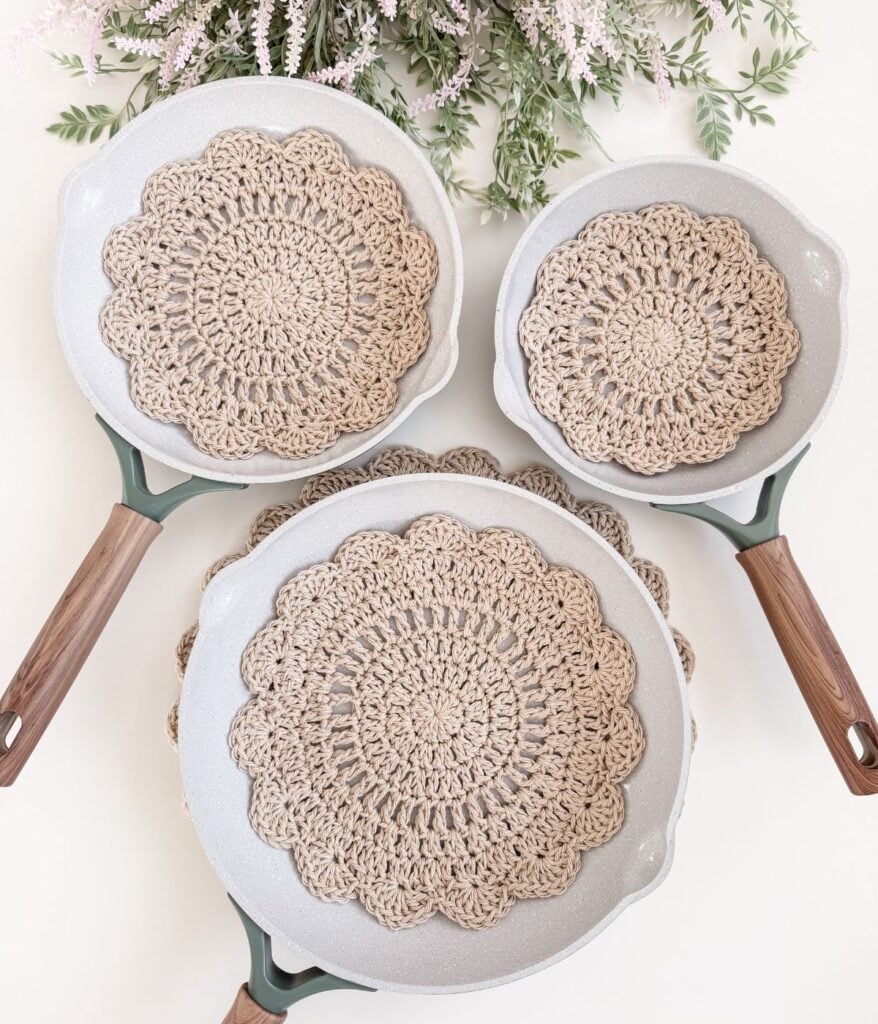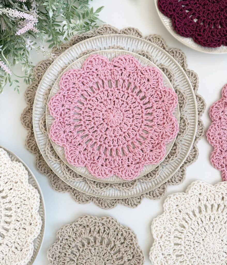 One of the best parts of this crochet placemat pattern is that it includes multiple sizes, allowing you to create several useful kitchen accessories from one design.