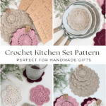 The Stacked Petals Kitchen Set is a versatile crochet pattern that includes five sizes, allowing you to create a full matching kitchen set. With this pattern, you can make a crochet placemat, a crochet coaster, and a crochet pot protector, all using the same elegant petal design.