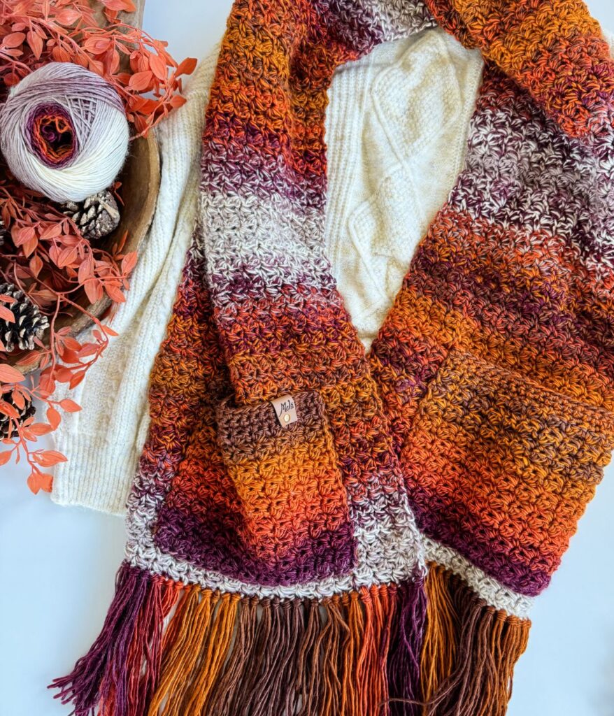 - Arrange fringe to follow the gradual fade of the yarn on both ends of the scarf.
