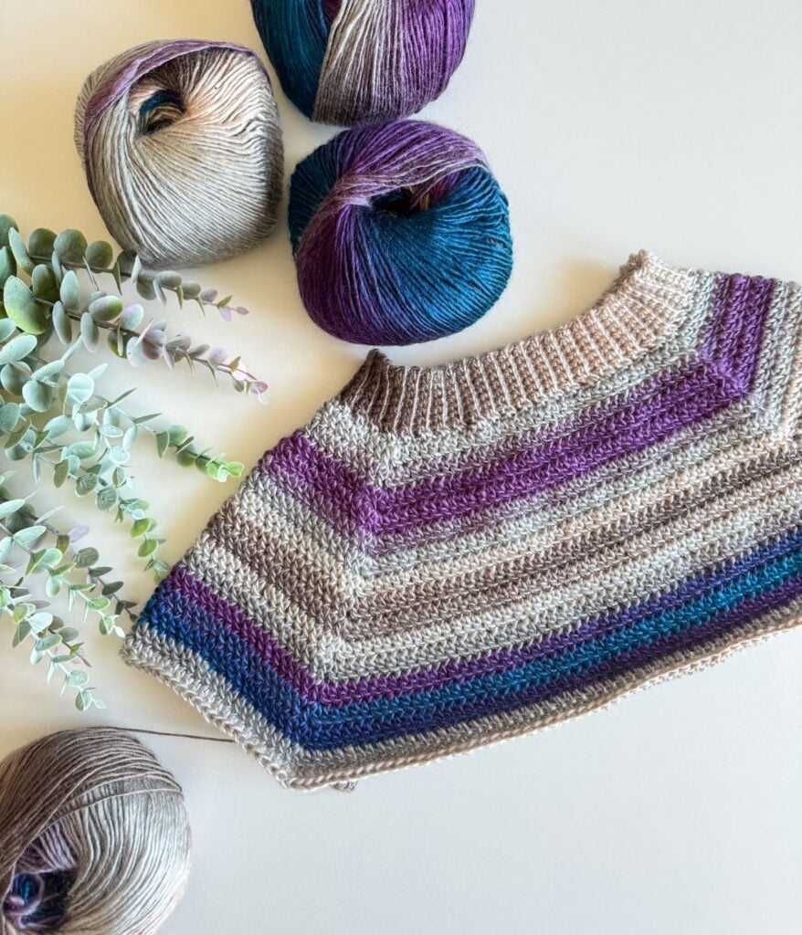 When using a gradient yarn in projects like this one, I often receive inquiries about how to join the yarn seamlessly. I typically unravel the ball to align with the previous colour for a smooth transition. When beginning sleeves, I ensure both match in colour for symmetry.