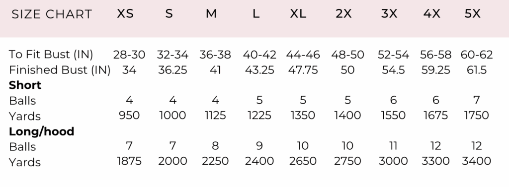 290yds/100g, 100% Acrylic Shown in Desert Sunset. See the size chart for yarn requirements in XS-5X