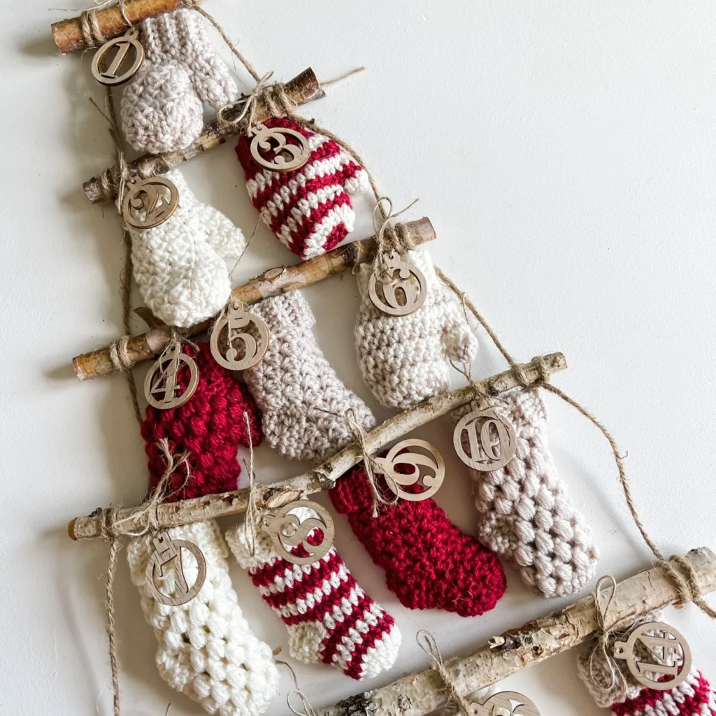 This Homemade Advent calendar comprises 6 patterns that are so easy to crochet! The Ebook includes 3 different mitten patterns and 3 different stocking patterns. You will need to make 4 of each to fill the advent calendar.