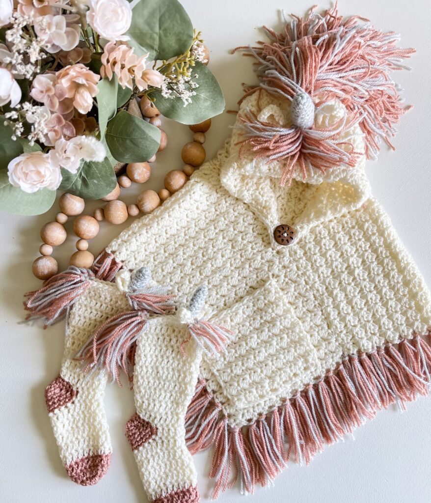 Crochet this adorable Hooded Unicorn Poncho with matching unicorn socks for a fun and whimsical set. The poncho features a playful unicorn hood, pocket, and fringe, worked in an easy stitch pattern using single and double crochet stitches. The beginner friendly socks are worked in simple double crochet. The poncho pattern includes baby to adult sizes, and the sock pattern includes baby to child sizes, with video tutorials available on YouTube.