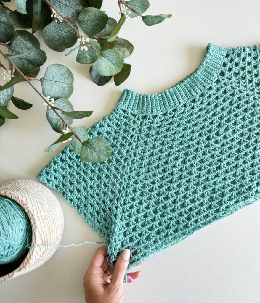 Introducing the V-Stitch Crochet Crewneck Top pattern, a delightful and breezy top seamlessly crocheted from the top down.