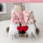 By simply changing colours and adding a small heart detail, your farmhouse gnome transforms into a Valentine’s Day gnome that is perfect for decorating, gifting, or selling.